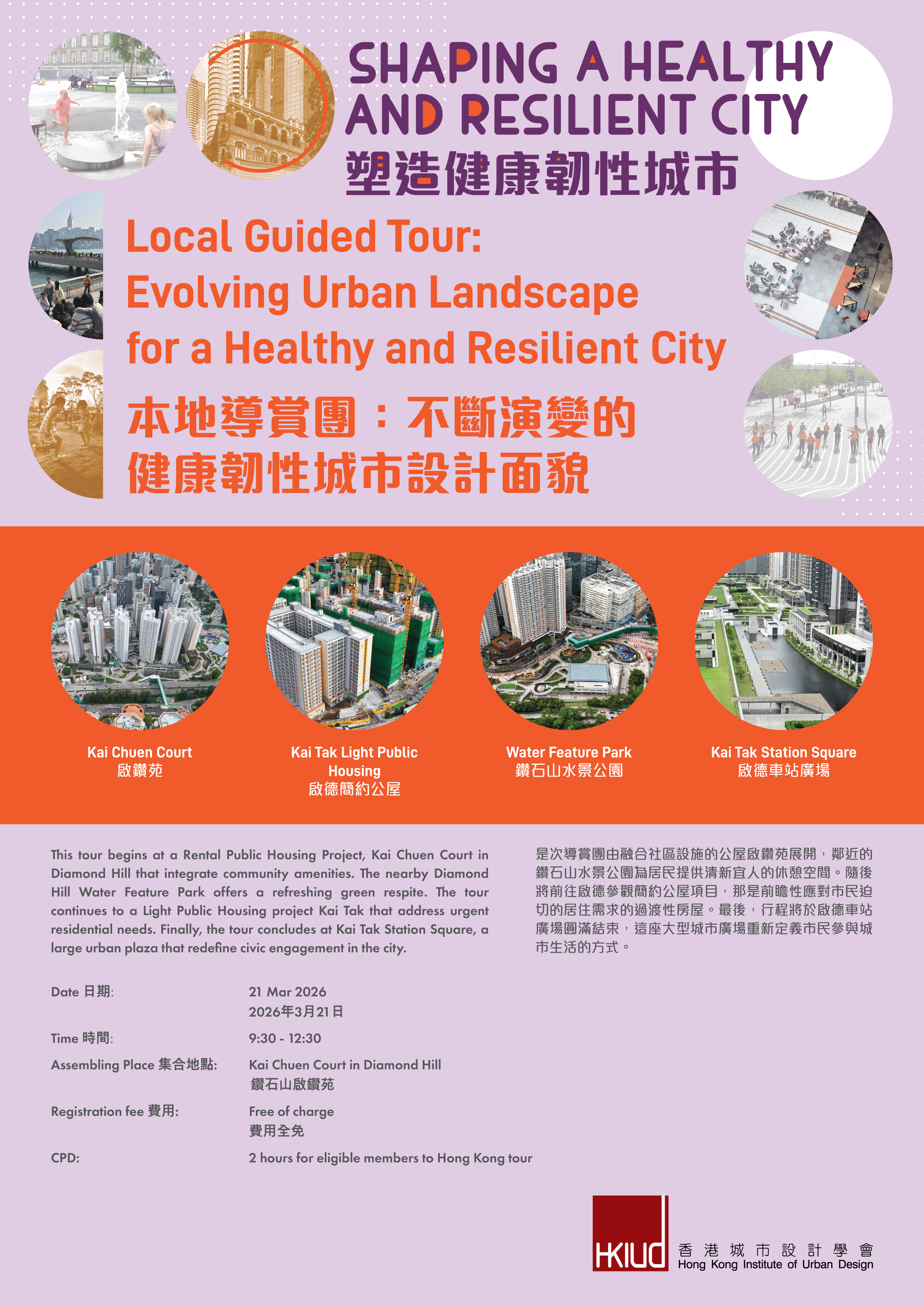 Join the HKIUD for a curated site tour through Hong Kong’s evolving urban landscape, featuring key destinations that showcase innovative housing and public space design. The journey begins at Housing Authority’s Public Rental Housing Project, Kai Chuen Court in Diamond Hill, a thoughtfully planned public housing estate integrating community amenities and sustainable design. Nearby, the Diamond Hill Water Feature Park offers a refreshing green respite with landscaped water elements. The tour continues to the Kai Tak Light Public Housing project, a pioneering transitional housing scheme addressing urgent residential needs. At Kai Yan Court, participants will explore compact, modern living within a vibrant urban setting. Finally, the tour concludes at Kai Tak Station Square, a large urban plaza, where ecological landscaping and public event spaces redefine civic engagement in the city. # Quota is limited. First comes first serve. |