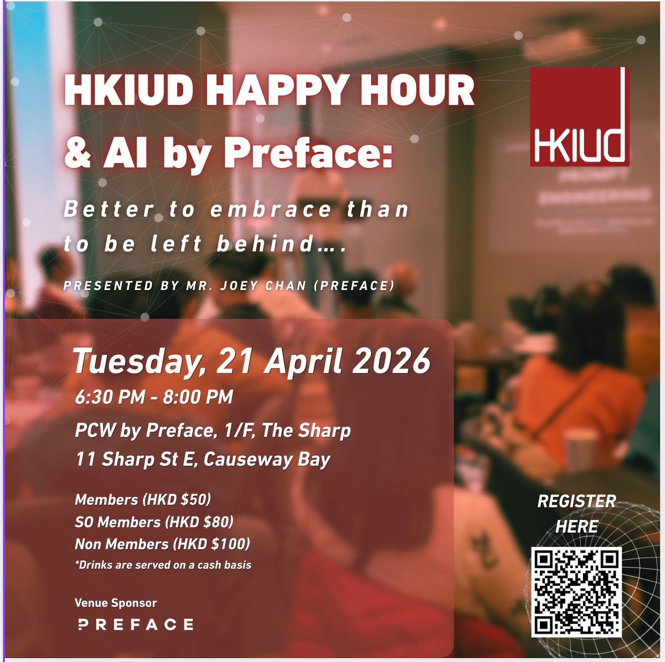 We are pleased to invite you to the next HKIUD Happy Hour and AI Event by Preface on 21 Apr 2025 (Tue) at 6:30pm onwards at PCW by Preface!
