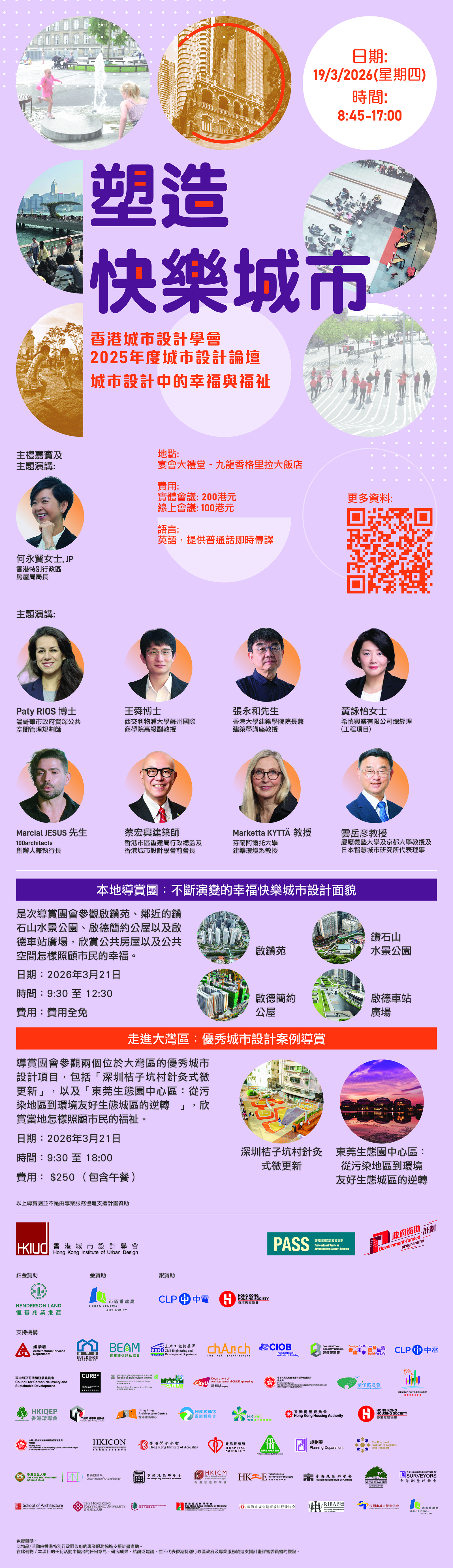 這次論壇是香港城市設計學會(HKIUD)舉辦的第八屆城市設計論壇,主題為「城市設計中的幸福與福祉: 塑造快樂城市」。在香港快速城市化的時代,「快樂城市」的概念作為重新構想城市生活的重要框架,與最新施政報告中提出的「追求幸福」願景相呼應。今年的論壇旨在探索如何透過用心的城市設計來提升市民的生活質量,促進幸福感、福祉以及社區參與。在「城市設計中的幸福與福祉: 塑造快樂城市」主題下,香港城市設計學會將匯聚本地及國際專業人士,以及政府部門和組織,共同探討以人為本、創造幸福城市的創新策略和願景。