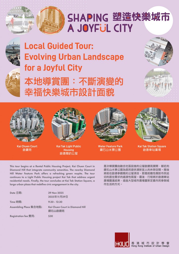 Join the HKIUD for a curated site tour through Hong Kong’s evolving urban landscape, featuring key destinations that showcase innovative housing and public space design. The journey begins at Housing Authority’s Public Rental Housing Project, Kai Chuen Court in Diamond Hill, a thoughtfully planned public housing estate integrating community amenities and sustainable design. Nearby, the Diamond Hill Water Feature Park offers a refreshing green respite with landscaped water elements. The tour continues to the Kai Tak Light Public Housing project, a pioneering transitional housing scheme addressing urgent residential needs. At Kai Yan Court, participants will explore compact, modern living within a vibrant urban setting. Finally, the tour concludes at Kai Tak Station Square, a large urban plaza, where ecological landscaping and public event spaces redefine civic engagement in the city.