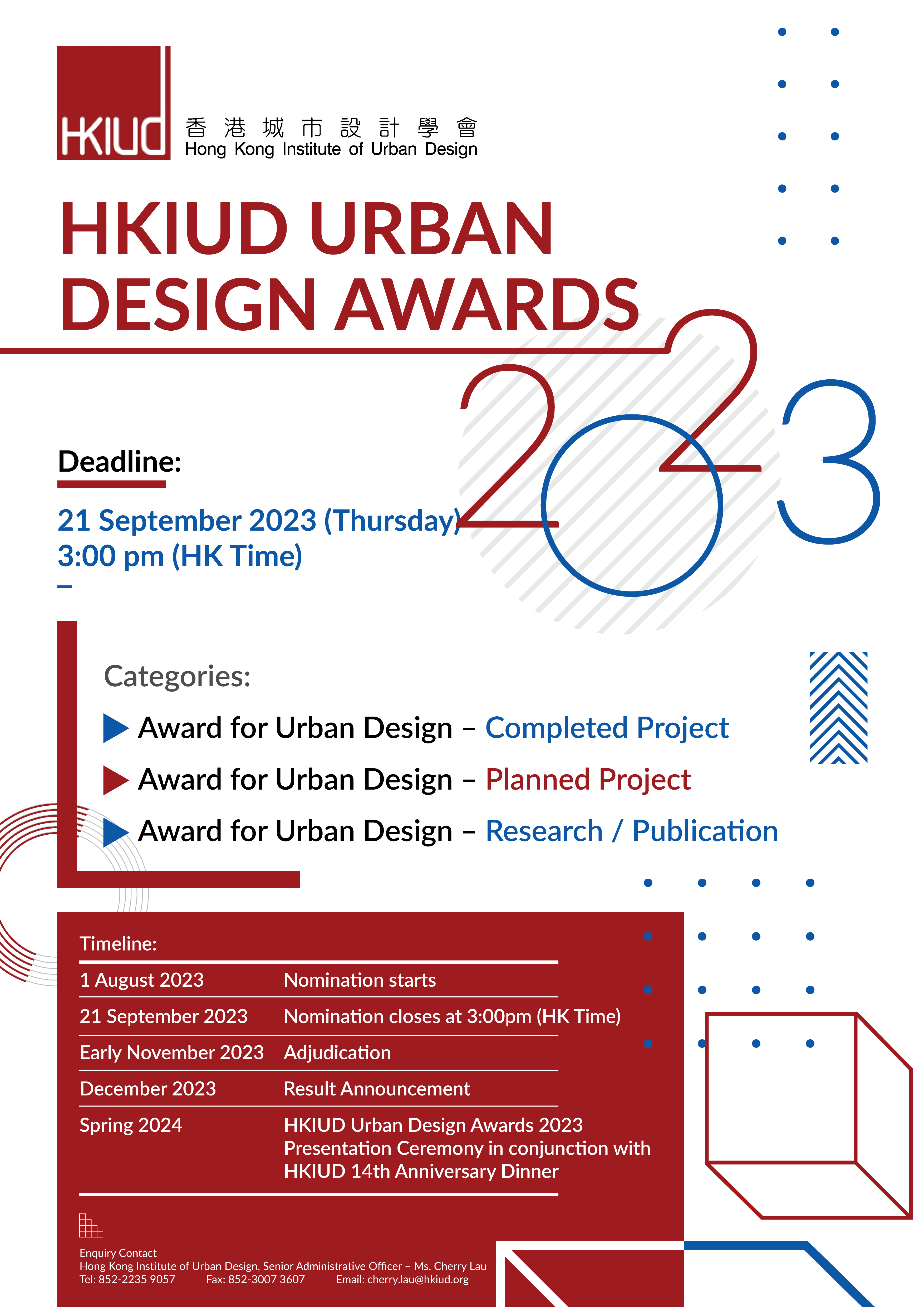 The Hong Kong Institute of Urban Design (HKIUD) Urban Design Awards 2023 aims at recognising urban design related projects, publications and research with outstanding performance and contribution in promoting excellence in Urban Design. The Awards are now open to all relevant projects under the following three categories.