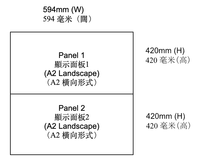 兩個A2 尺寸的顯示面板(單面,橫向形式)、所遞交的兩個顯示面板應從上而下對齊展示,請勿從左到右展示,如下圖所示。 顯示面板應該是平面的,沒有任何投射和裝飾物。