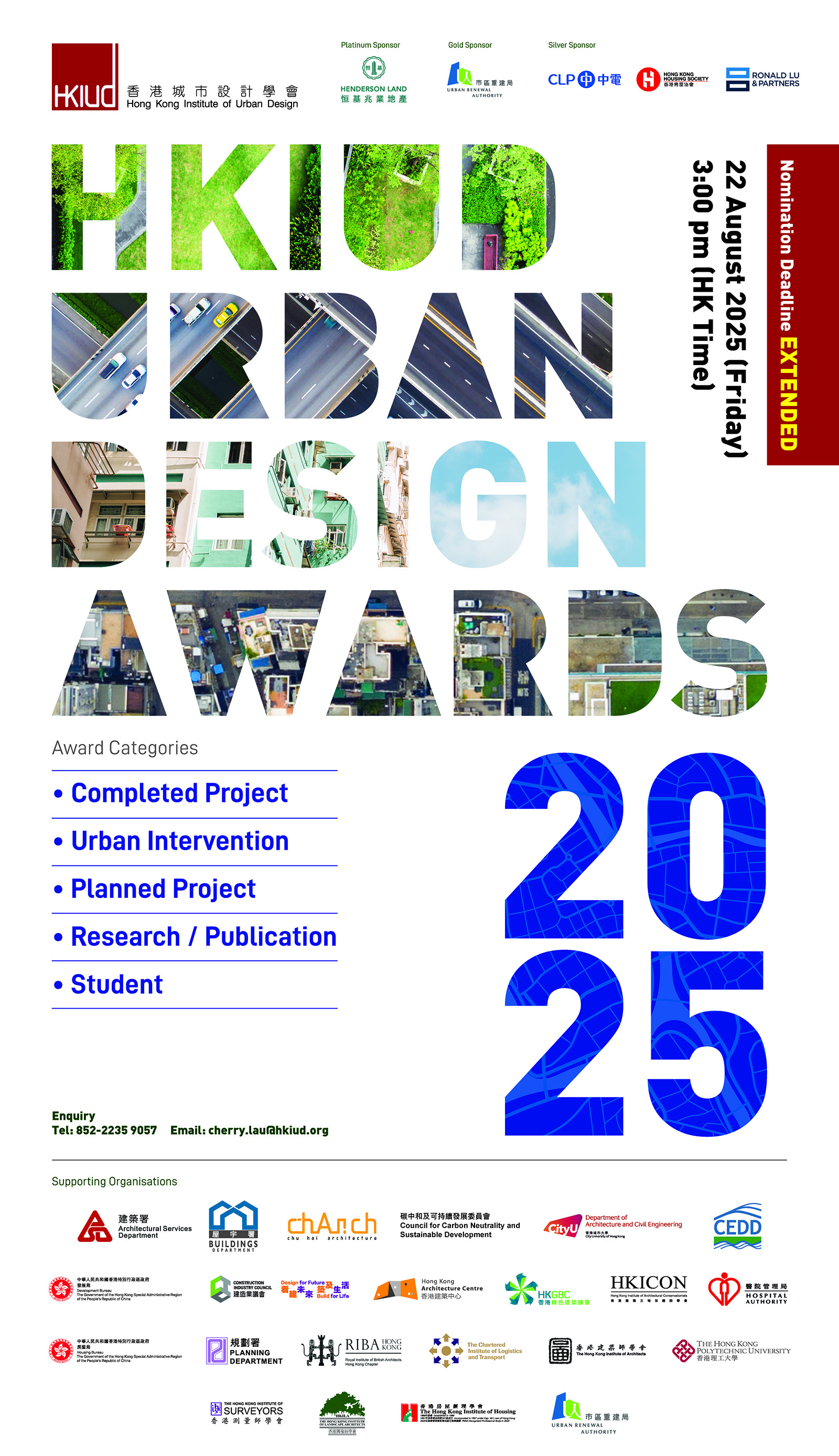 The Hong Kong Institute of Urban Design (HKIUD) Urban Design Awards 2025 aims at recognising urban design related projects, publications and research with outstanding performance and contribution in promoting excellence in Urban Design. The Awards are now open to all relevant projects under the following four categories.